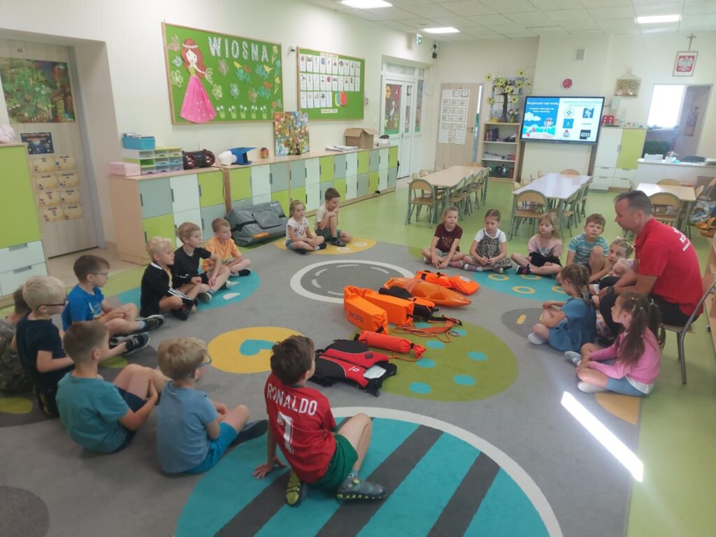 Dzieci dowiedziały się wielu potrzebnych rzeczy: Jak należy zachowywać się nad zbiornikami wodnymi. Wyjaśnił co to są falochrony i dlaczego nie należy się do nich zbliżać podczas kąpieli w morzu. Przypomniał numery alarmowe. Zaprezentował sprzęt, stroje do ratowania życia oraz jak udzielić pierwszej pomocy i prawidłowo wykonywać resuscytację krążeniowo-oddechową. Dzieci chętnie ćwiczyły na fantomach. Warsztaty były bardzo ciekawe i pouczające, bo to wiedza, która może uratować czyjeś życie. Serdecznie dziękujemy Panu Krzysztofowi za tak niezwykle ważną dawkę wiedzy przed zbliżającymi się wakacjami.